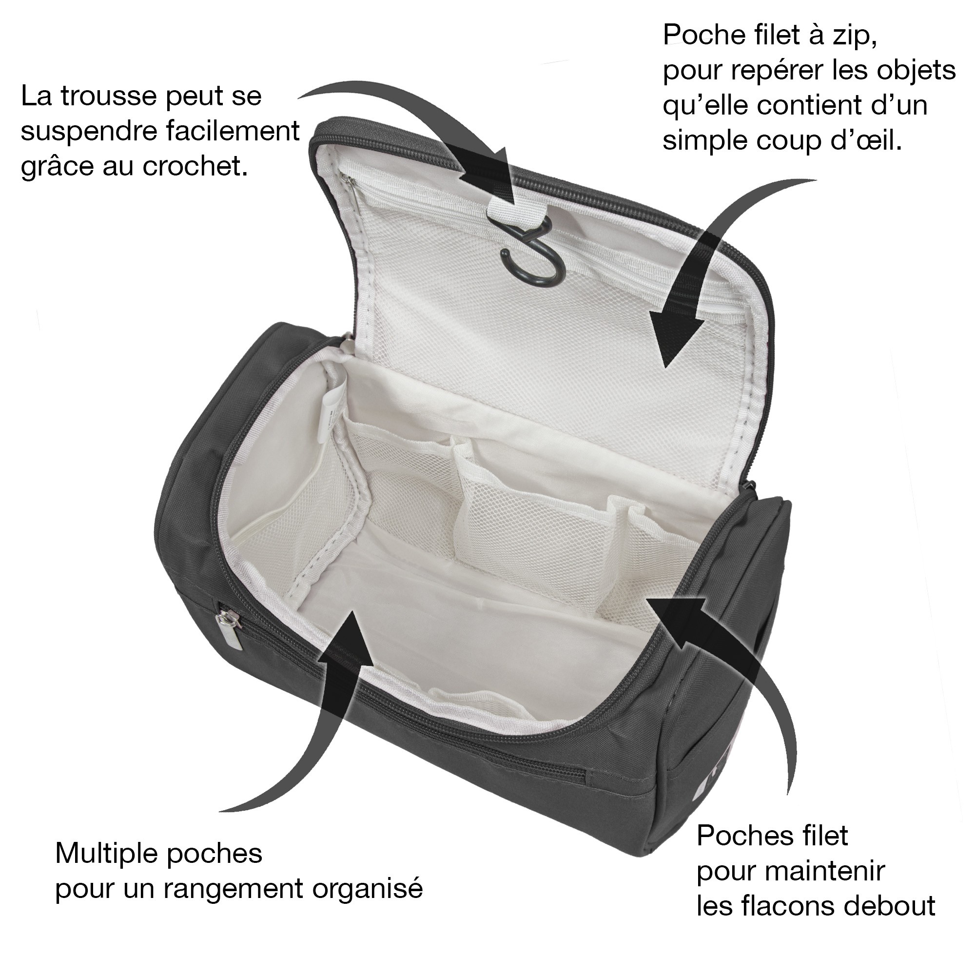 Trousse de toilette textile à suspendre, en polyester enduit résistant à l'eau, légère et compacte pour accueillir tous les produits de soins essentiels au quotidien, en voyage comme à la maison. Elle est équipée d’une poche frontale avec fermeture à glissière et de deux poches plaquées sur les côtés. Elle s'ouvre sur un grand compartiment central avec 7 poches en maille pour maintenir les flacons debout sur les 4 côtes du vanity, libérant ainsi un grand espace de rangement. Une poche en filet se trouve sous le rabat. Une poche plate zippée est placée sur le devant. Fonctionnelle grâce à son crochet de suspension pour la suspendre rapidement au mur ou derrière une porte, mais aussi grâce à ses poches en maille qui permettent de trouver en un clin d'œil ce que l'on cherche. Une poignée en sangle sur le dessus.
