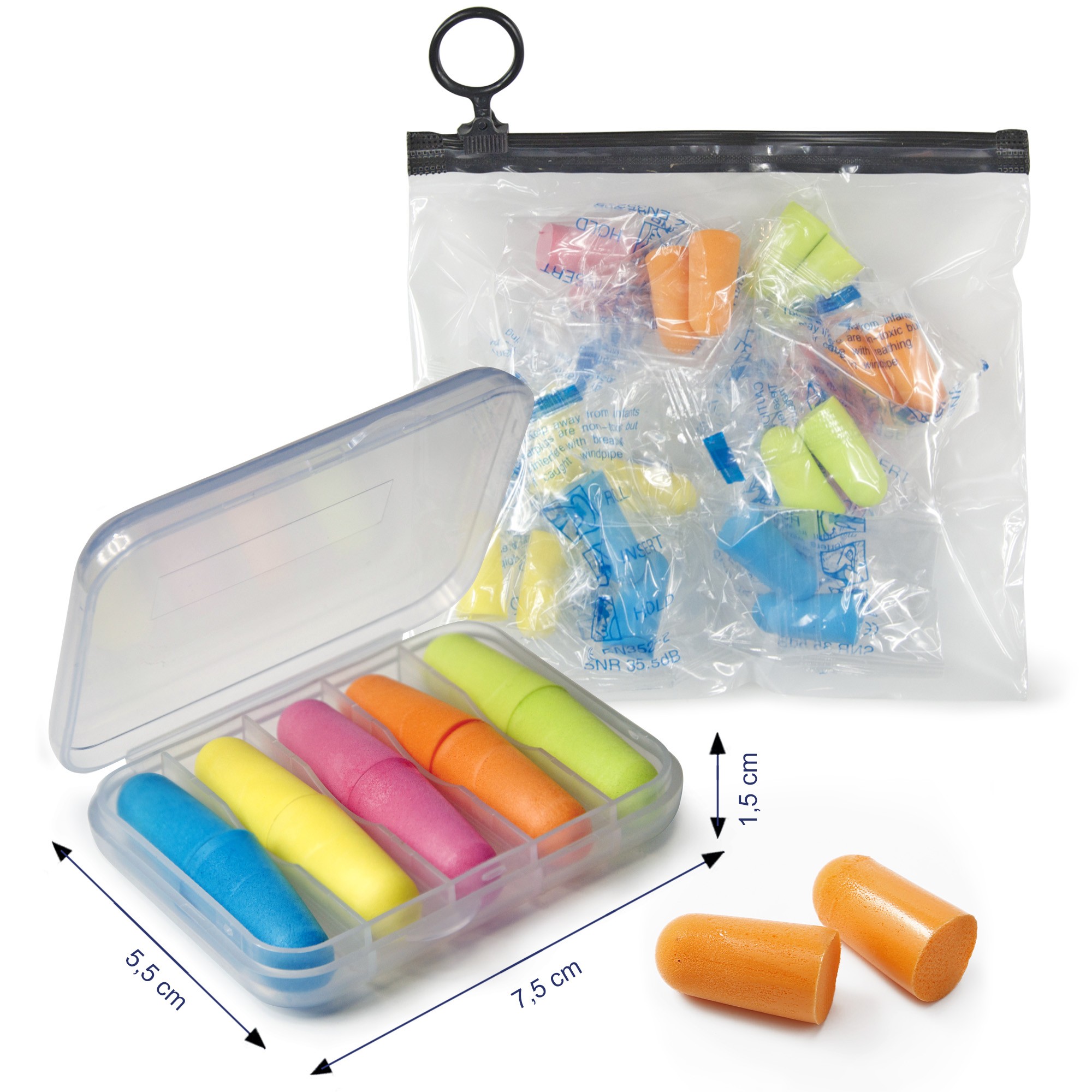 1 boite de transport translucide avec 5 paires de bouchons multicolores + 1 pochette de rangement avec 10 paires de recharges.