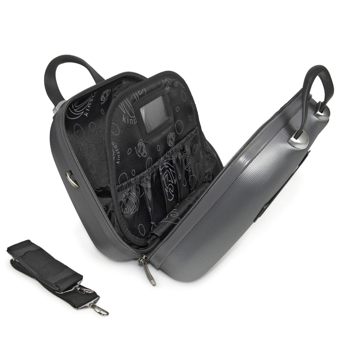 A l'intérieur 2 larges compartiments avec un séparateur pourvu d'une poche zippée qui sécurisera les objets les plus fragiles, et d'un miroir de courtoisie.