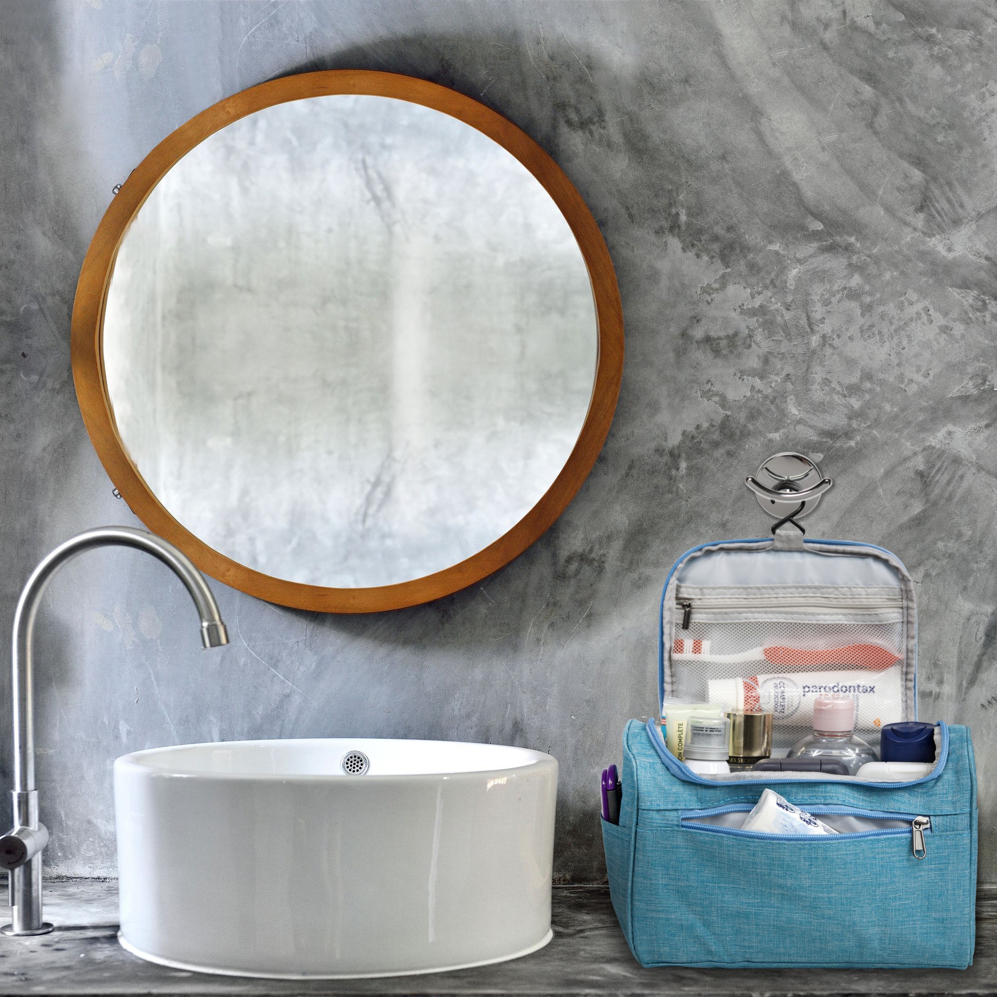 Trousse de toilette textile à suspendre en polyester enduit résistant à l'eau, légère et compacte pour accueillir tous les produits de soins essentiels au quotidien, en voyage comme à la maison. Elle est équipée d’une poche frontale avec fermeture à glissière et de deux poches plaquées sur les côtés. Elle s'ouvre sur un grand compartiment central avec 7 poches en maille pour maintenir les flacons debout sur les 4 côtes du vanity, libérant ainsi un grand espace de rangement. Une poche en filet se trouve sous le rabat. Fonctionnelle grâce à son crochet de suspension pour la suspendre rapidement au mur ou derrière une porte, mais aussi grâce à ses poches en maille qui permettent de trouver en un clin d'œil ce que l'on cherche. Une poignée en sangle sur le dessus.