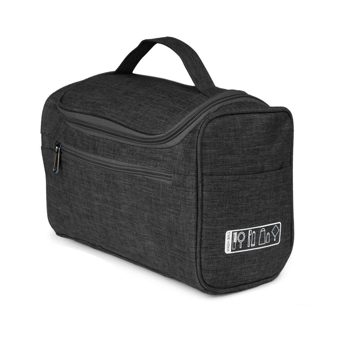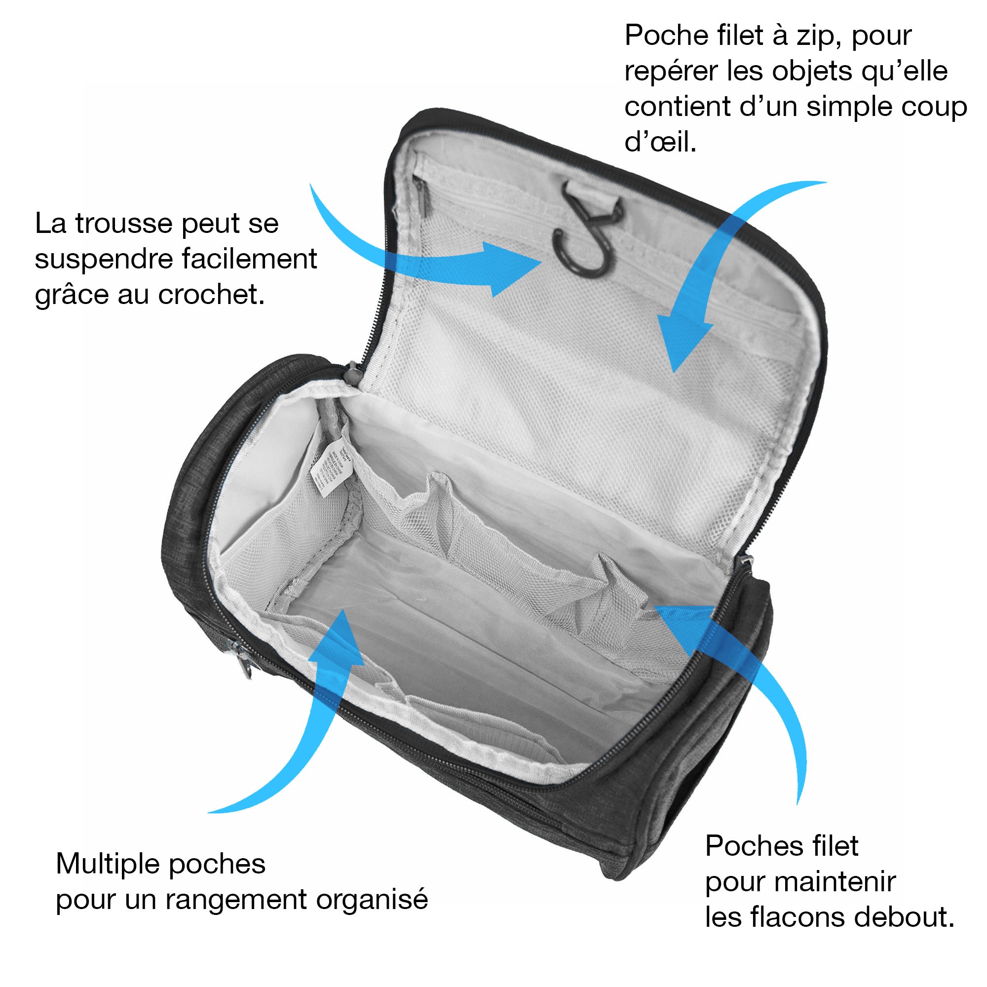Trousse de toilette textile à suspendre en polyester enduit résistant à l'eau, légère et compacte pour accueillir tous les produits de soins essentiels au quotidien, en voyage comme à la maison. Elle est équipée d’une poche frontale avec fermeture à glissière et de deux poches plaquées sur les côtés. Elle s'ouvre sur un grand compartiment central avec 7 poches en maille pour maintenir les flacons debout sur les 4 côtes du vanity, libérant ainsi un grand espace de rangement. Une poche en filet se trouve sous le rabat. Fonctionnelle grâce à son crochet de suspension pour la suspendre rapidement au mur ou derrière une porte, mais aussi grâce à ses poches en maille qui permettent de trouver en un clin d'œil ce que l'on cherche. Une poignée en sangle sur le dessus.