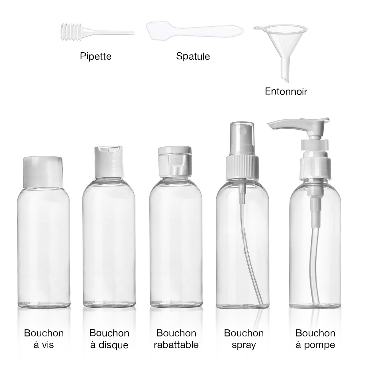 Remplissez les contenants avec vos produits de beauté (shampoing, lotion, parfum... ) et partez en voyage en toute tranquillité sans vous encombrer et sans soucis d'embarquement.