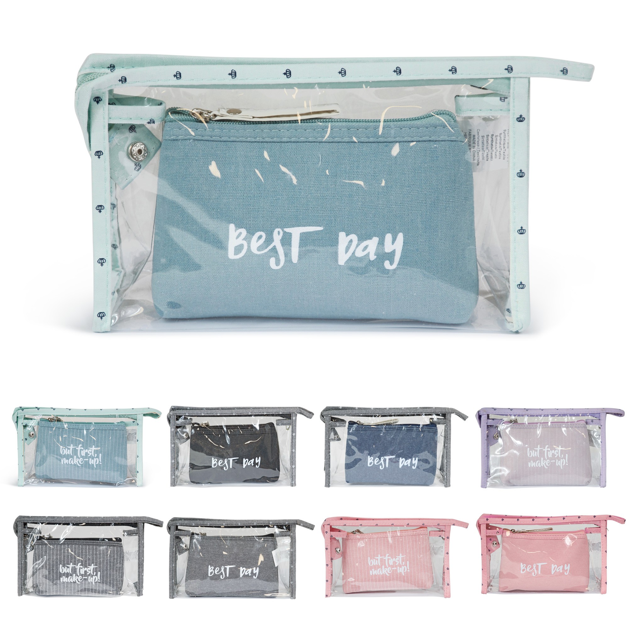 - La grande trousse de toilette a des finitions en textile imprimé, assorties aux trousses, les panneaux sont en PVC transparent.