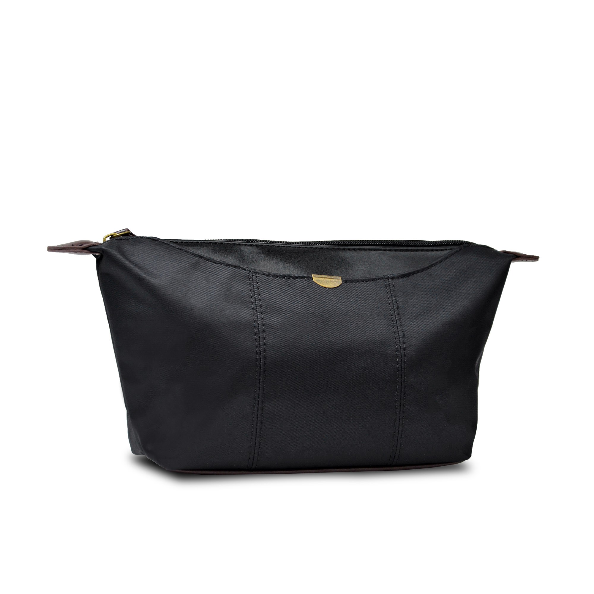Trousse multi-usage pour femme, avec dessous renforcé, fermeture zippée, et poche frontale avec fermeture par bouton pression.