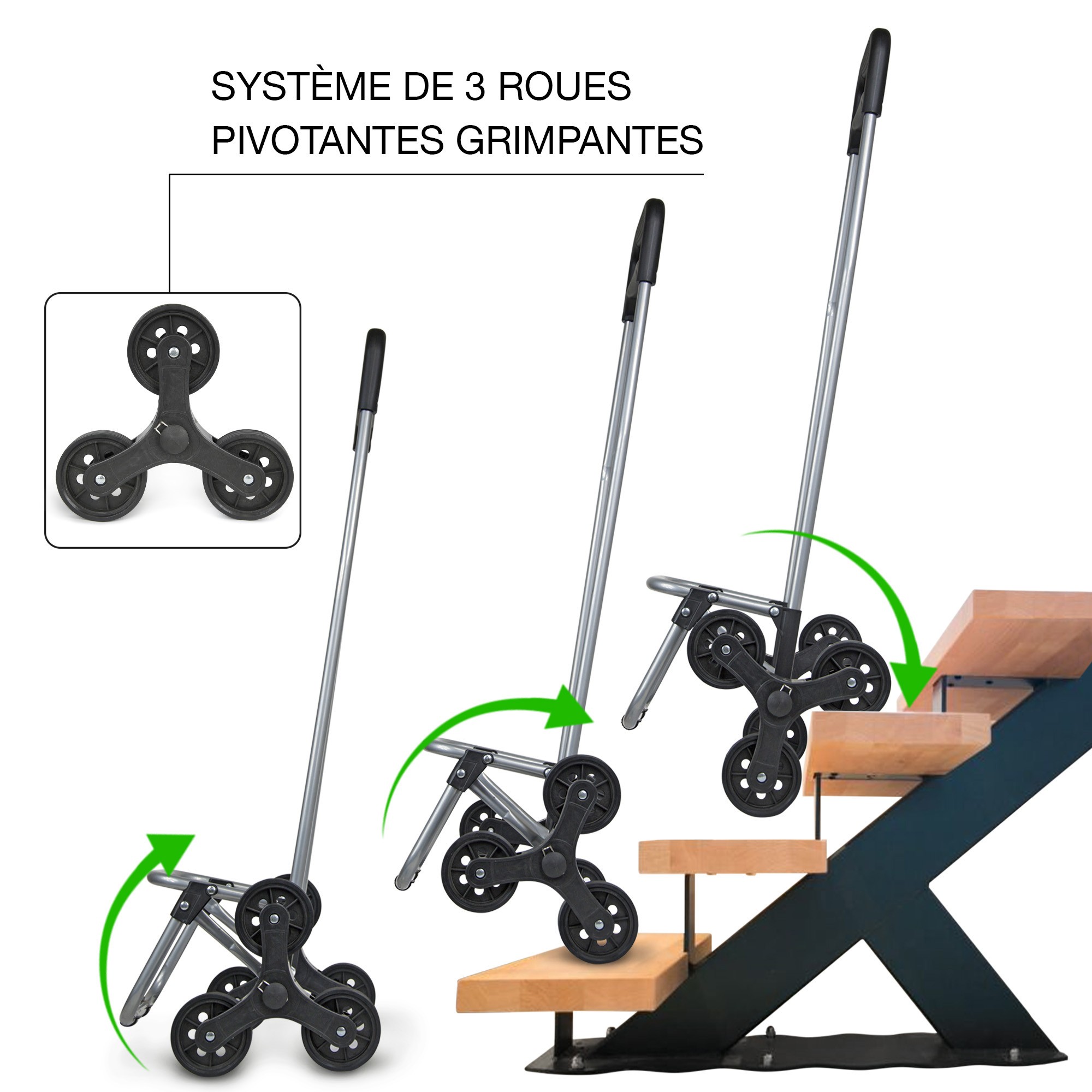 Chariot de courses 3 roues avec structure en métal pliable. Roues spéciales pour monter les trottoirs ou escaliers en gomme résistante.