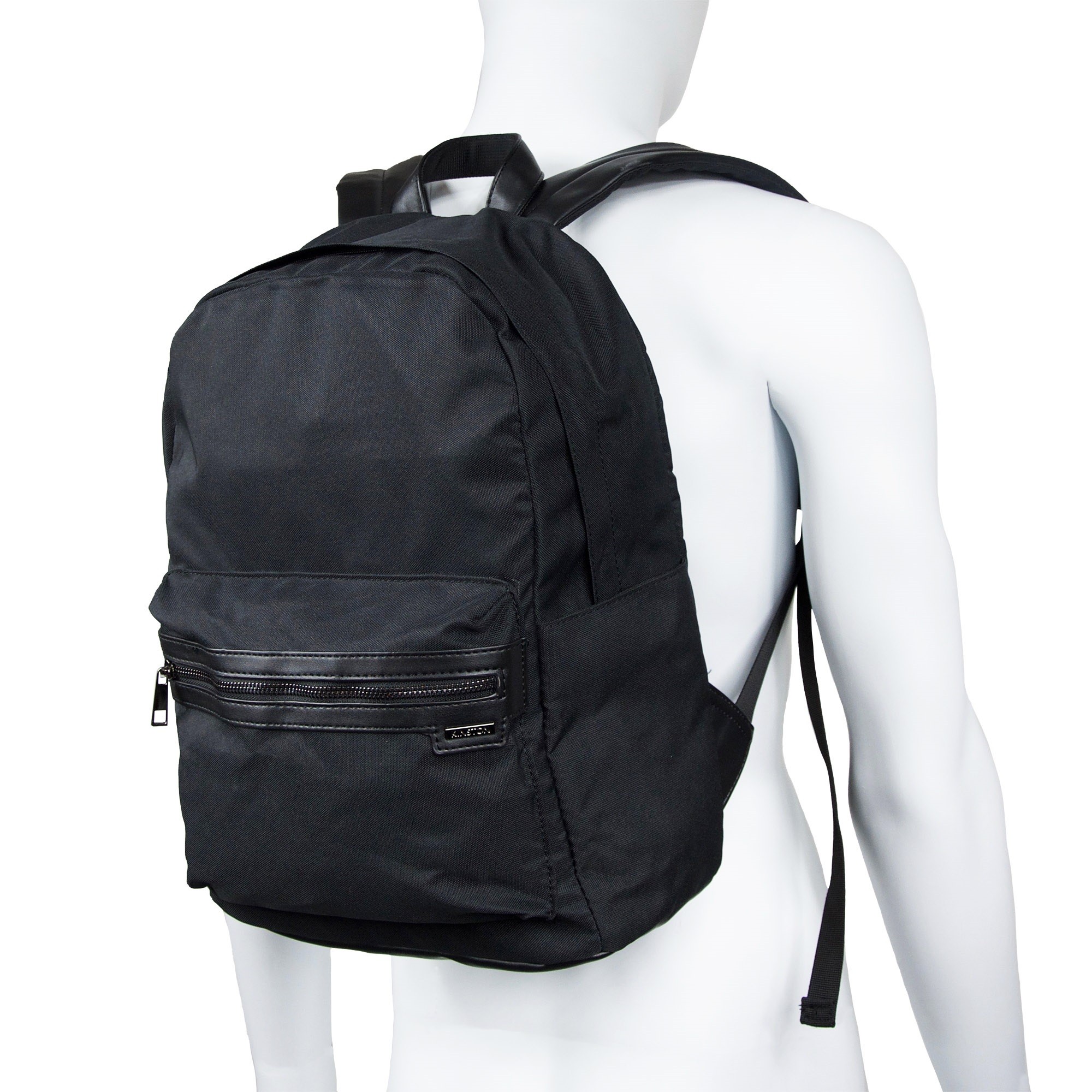 - Le grand compartiment central avec zip double curseurs, offre : côté dos, une poche moussée pour laptop ainsi qu’une poche zippée avec empiècement logoté. Coté face, 2 poches plates pour smartphone, batterie, stylos etc.