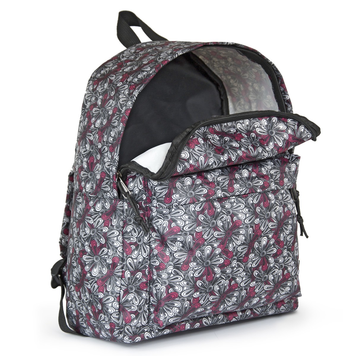 1 compartiment central + 1 poche frontale zippée, 1 poignée en sangle, bretelles réglables. Dos et bretelles rembourrés.