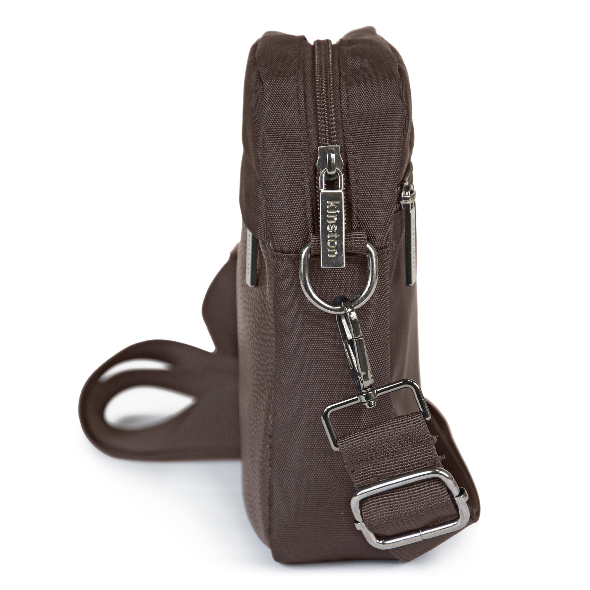 Sacoche Kinston, bi-matières, en polyester et synthétique grainé. Pratique et peu encombrante, elle peut contenir tous les indispensables du quotidien, un smartphone, une batterie mais aussi un portefeuille, des clés...