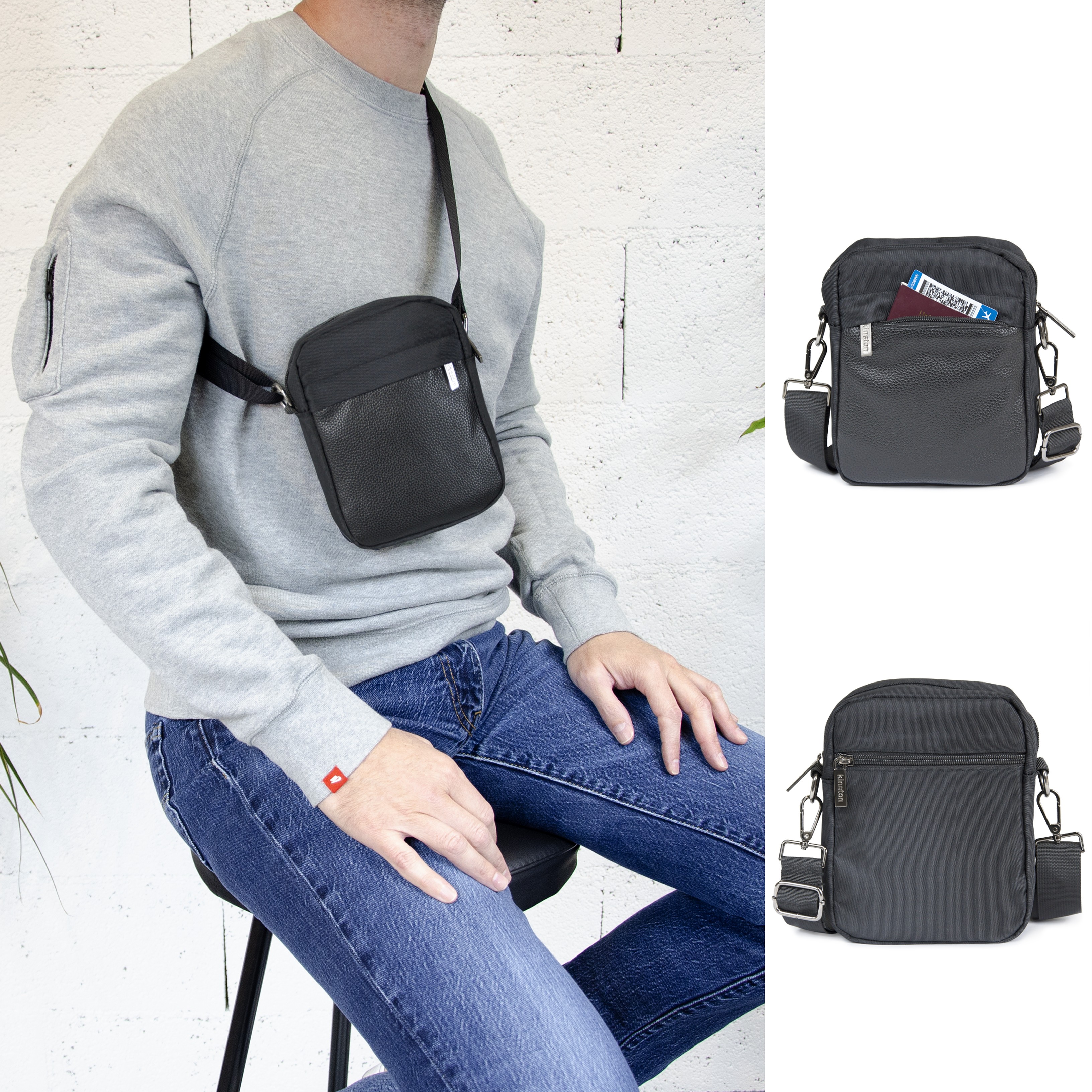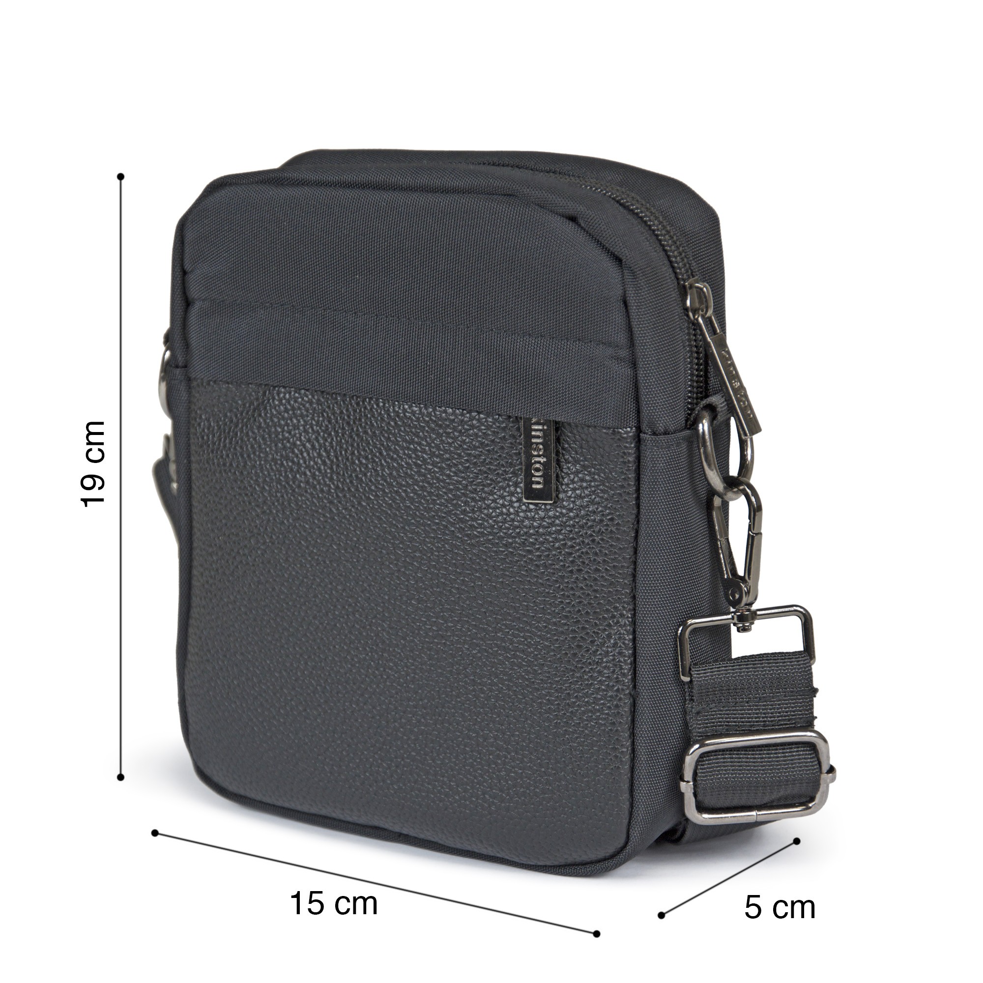 Sacoche Kinston, bi-matières, en polyester et synthétique grainé. Pratique et peu encombrante, elle peut contenir tous les indispensables du quotidien, un smartphone, une batterie mais aussi un portefeuille, des clés...