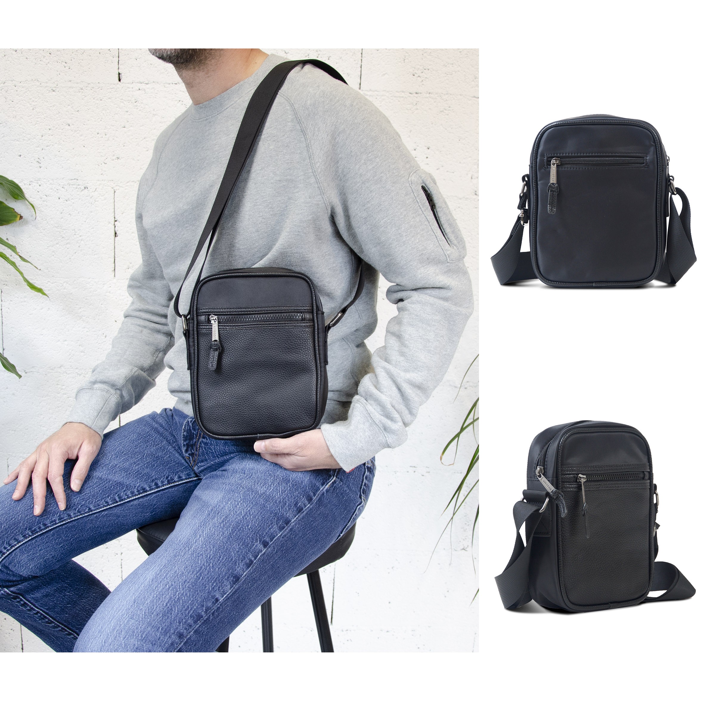 Sacoche Kinston, bi-matières, en polyester et synthétique grainé. Pratique et peu encombrante, elle peut contenir tous les indispensables du quotidien, un smartphone, une batterie mais aussi un portefeuille, des clés...