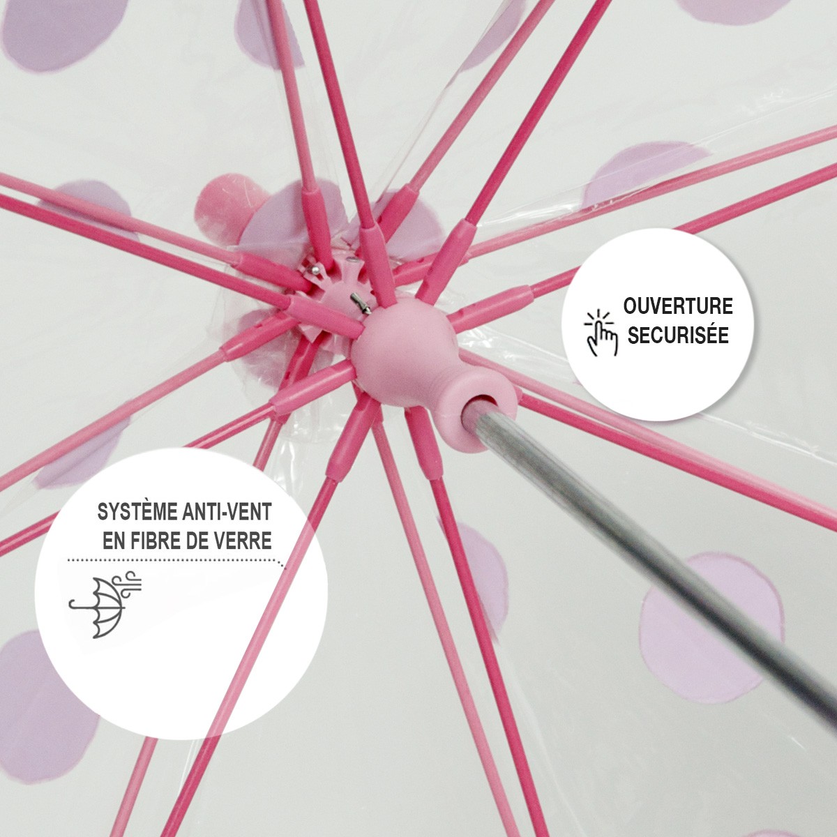 Ouverture manuelle : il suffit de pousser ou de tirer pour l'ouvrir ou le fermer : système d'ouverture autobloquant afin que les enfants ne risquent pas de se blesser ou de se coincer les doigts. Poignée et baleines en plastique rose.