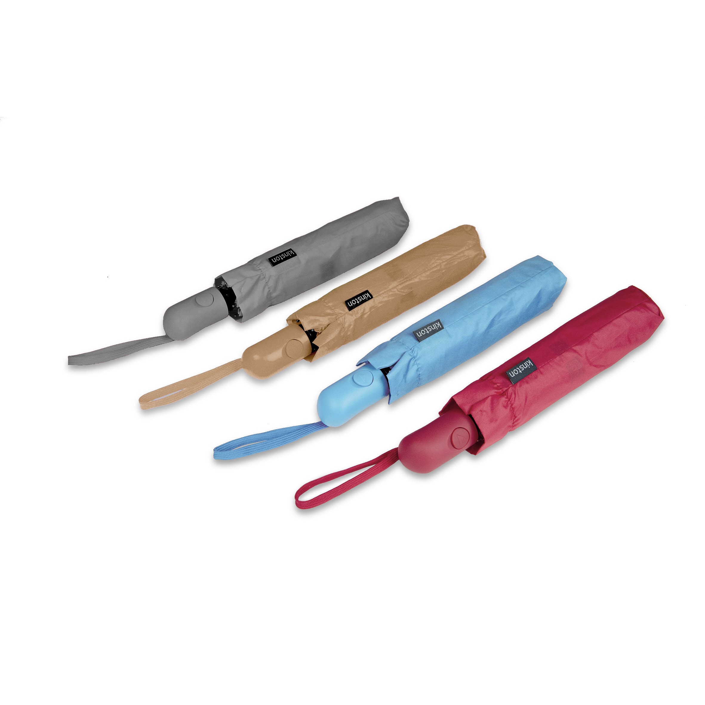 Parapluies pliants unis : bleu, orange, rouge et jaune. Compact et pratique avec ouverture automatique. Poignée gomme et housse ton sur ton.