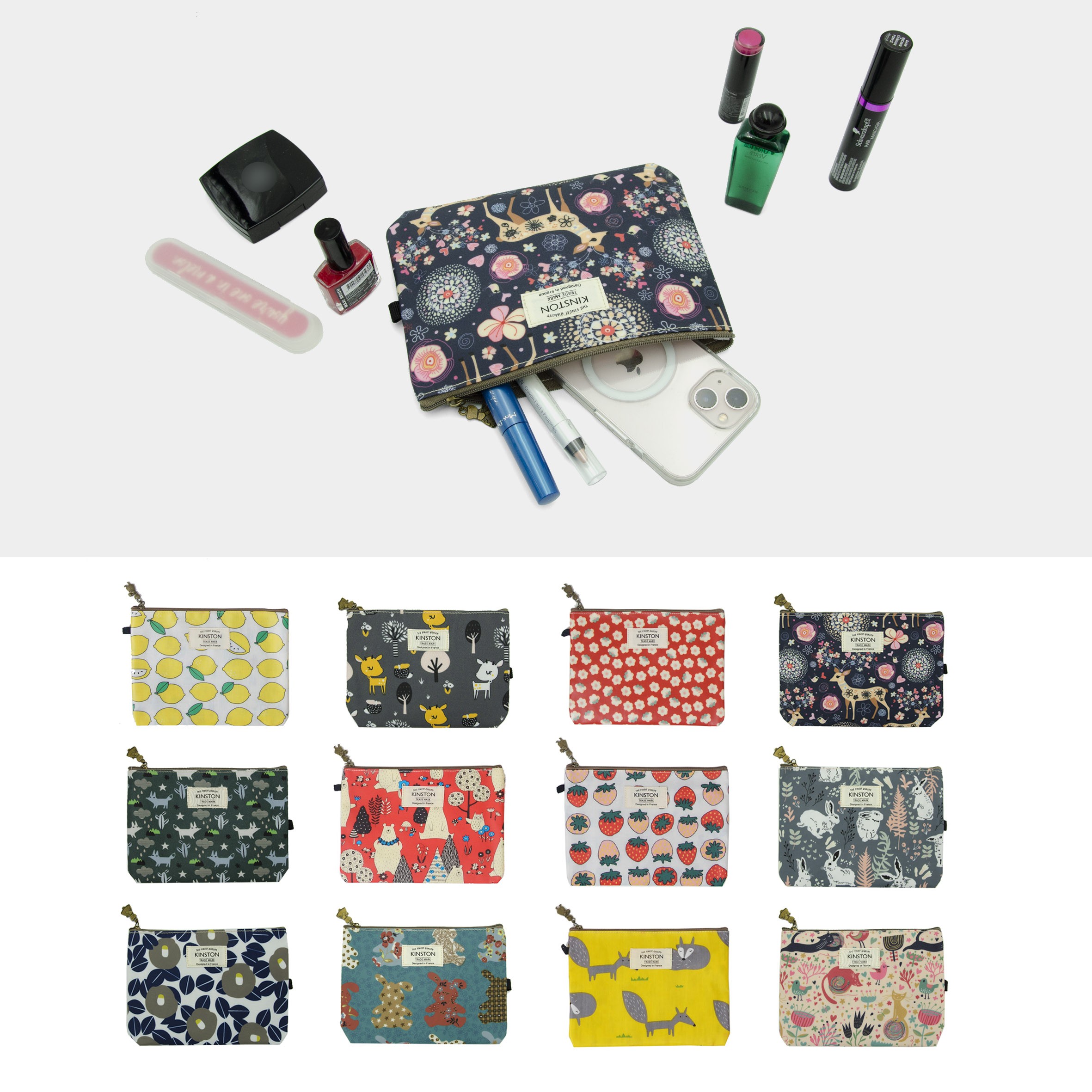 Cette trousse en polyester déperlant imprimé a de multi-usages, elle peut aussi bien contenir des affaires de classe que des affaires de toilette, du maquillage ou d’autres objets du quotidien : smartphone, monnaie etc.