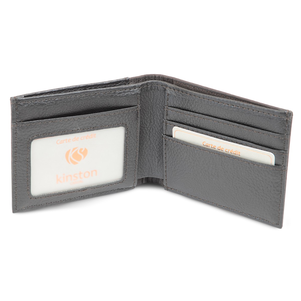 Portefeuille horizontal bi-matières. Il se compose d'un volet avec trois emplacements pour cartes format bancaire, un volet avec une poche plaquée transparente pour la carte d'identité et d’une double poche pour les billets et les documents.