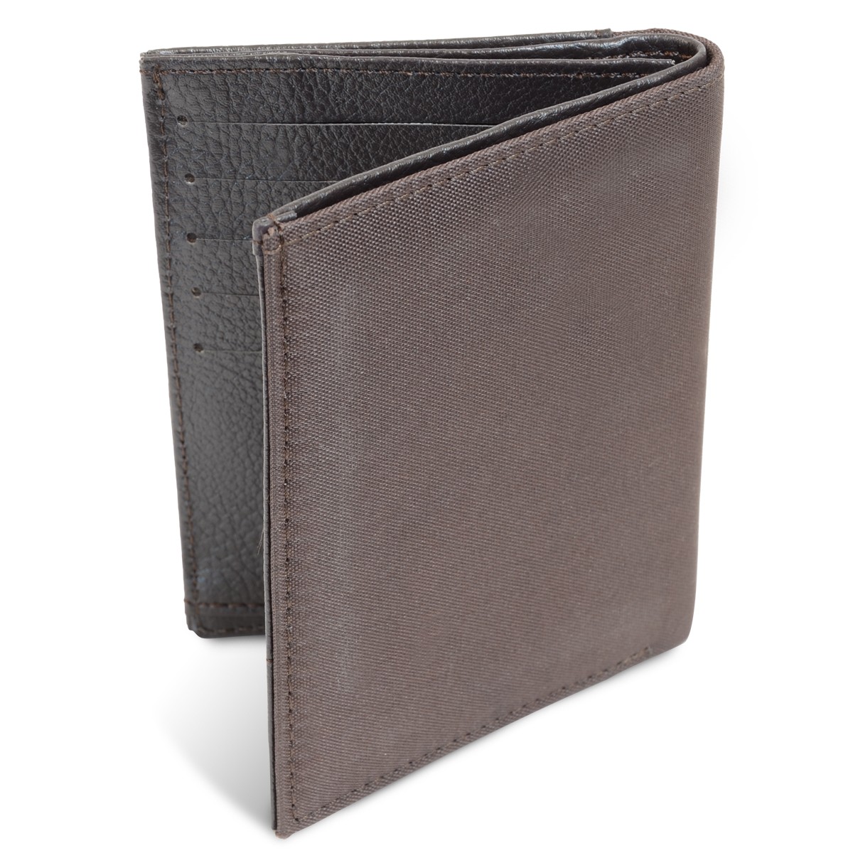 Portefeuille bi-matières. Idéal par son format généreux et pratique grâce à ses multiples emplacements. Il comprend une grande poche à billets,. Un volet avec un porte-monnaie zippé et une poche plaquée dessus avec surpiqûres + une poche plate multifonctions. Une poche centrale transparente. Un volet avec une poche transparente et cinq emplacements pour cartes.