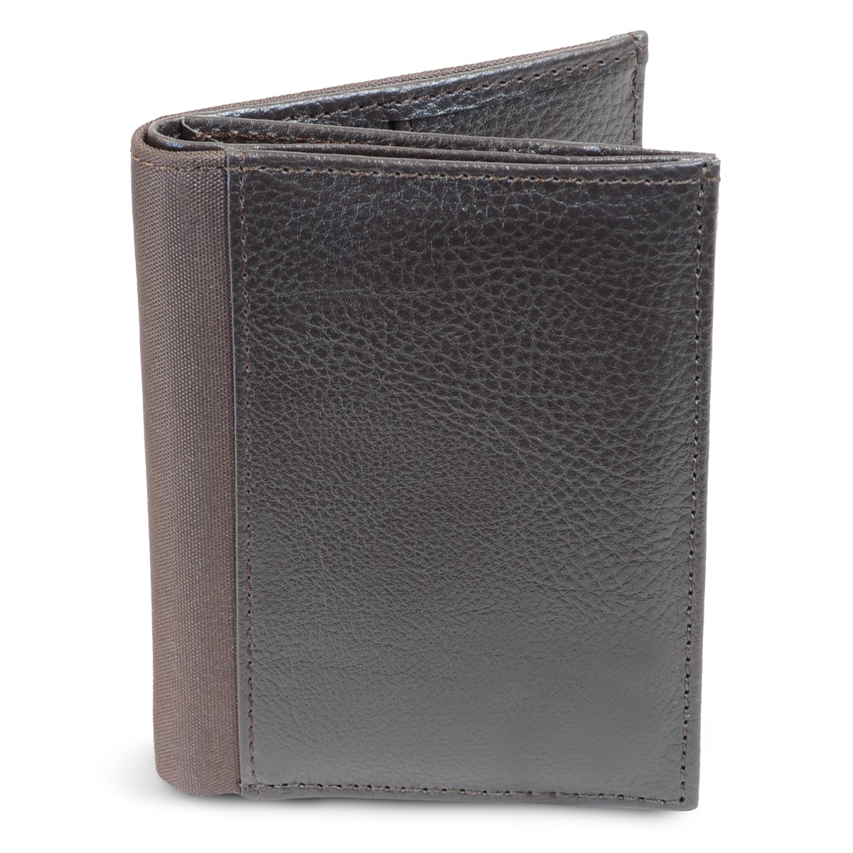 Portefeuille bi-matières. Idéal par son format généreux et pratique grâce à ses multiples emplacements. Il comprend une grande poche à billets,. Un volet avec un porte-monnaie zippé et une poche plaquée dessus avec surpiqûres + une poche plate multifonctions. Une poche centrale transparente. Un volet avec une poche transparente et cinq emplacements pour cartes.