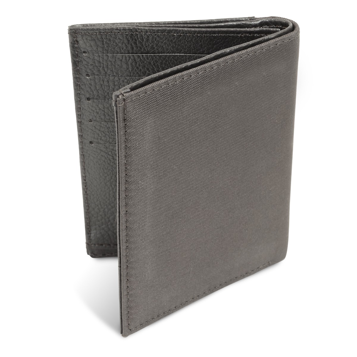 Portefeuille bi-matières. Idéal par son format généreux et pratique grâce à ses multiples emplacements. Il comprend une grande poche à billets,. Un volet avec un porte-monnaie zippé et une poche plaquée dessus avec surpiqûres + une poche plate multifonctions. Une poche centrale transparente. Un volet avec une poche transparente et cinq emplacements pour cartes.