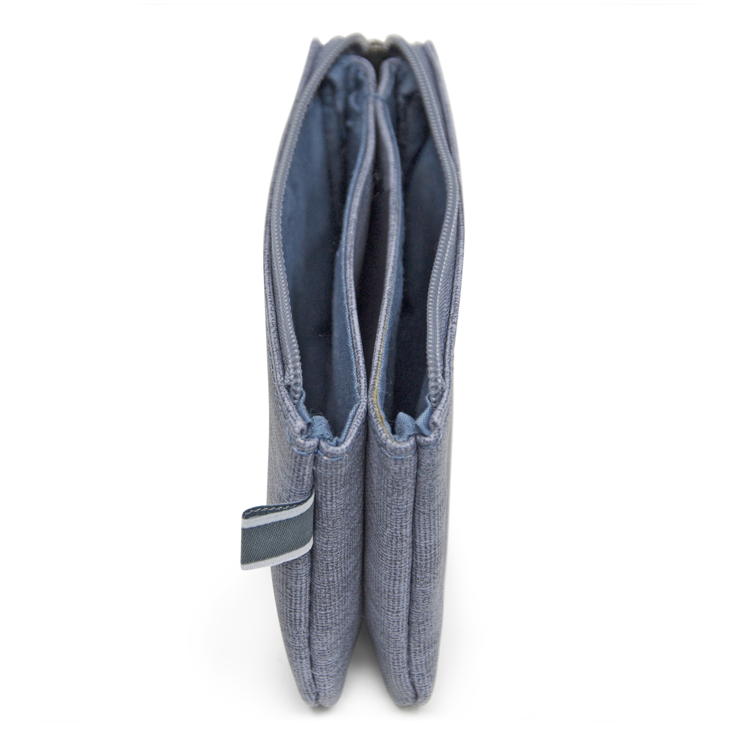 Sous la fermeture à glissière centrale se trouvent : 2 poches plates et 1 poche centrale. Le curseur en métal canon de fusil est équipé d'une longue tirette souple.