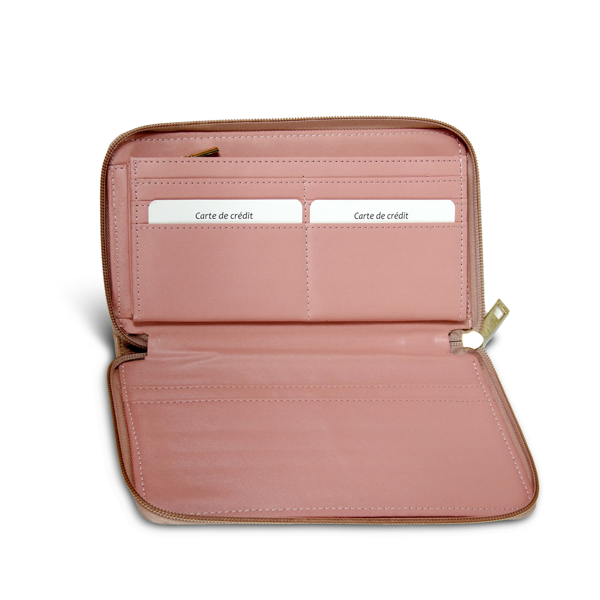 Fermeture à glissière sur 3 côtés. 2 volets intérieurs : 2 grands emplacements pour le chéquier et les papiers, 2 souflets avec une poche porte-monnaie zippée, 2 grands compartiments, 2 poches plaquées et 6 emplacements CB.
