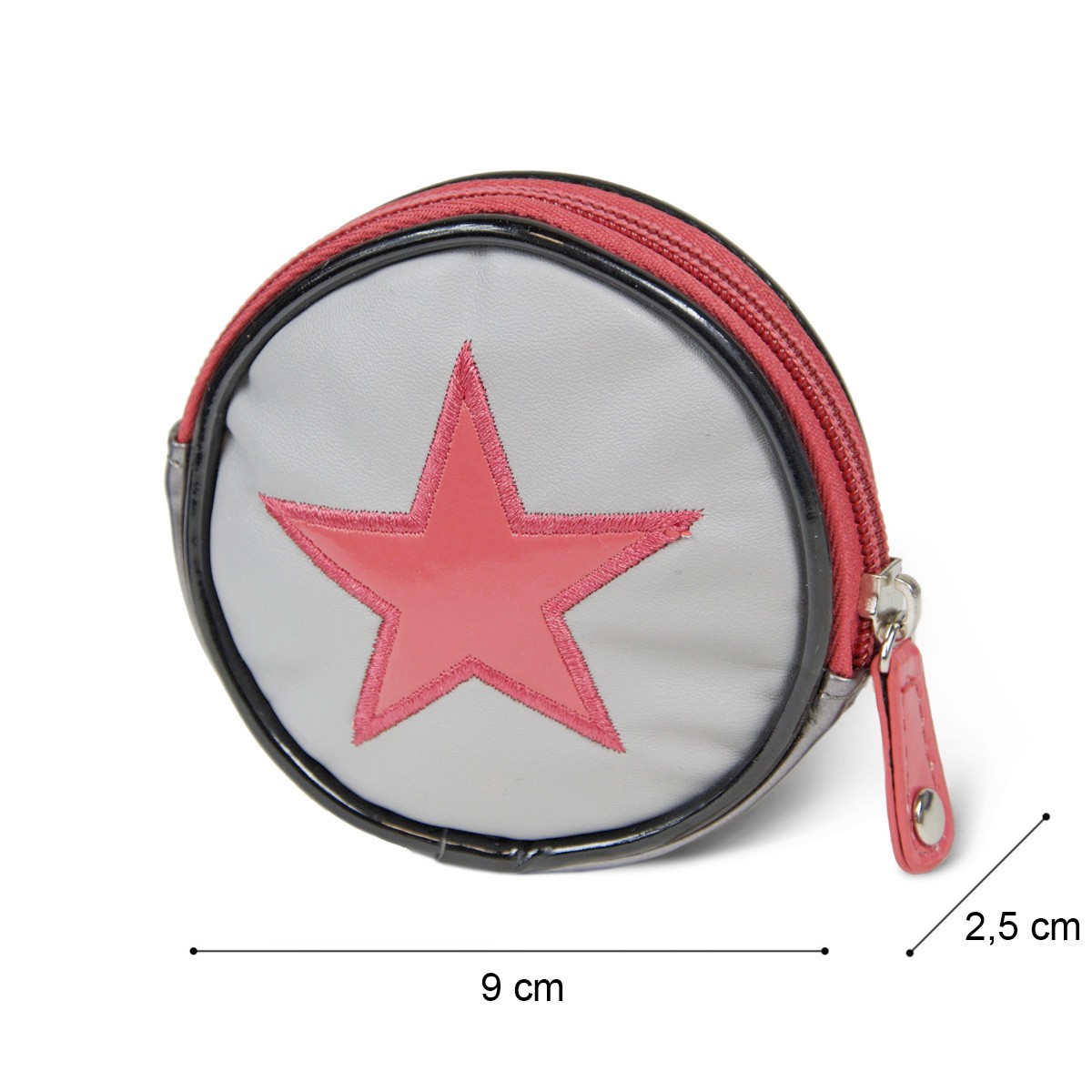 Petit porte-monnaie rond multi-matières, irisé bronze au dos et sur le côté, passepoil vernis noir, gris mat sur le devant avec étoile colorée en vernis assortie au zipper.