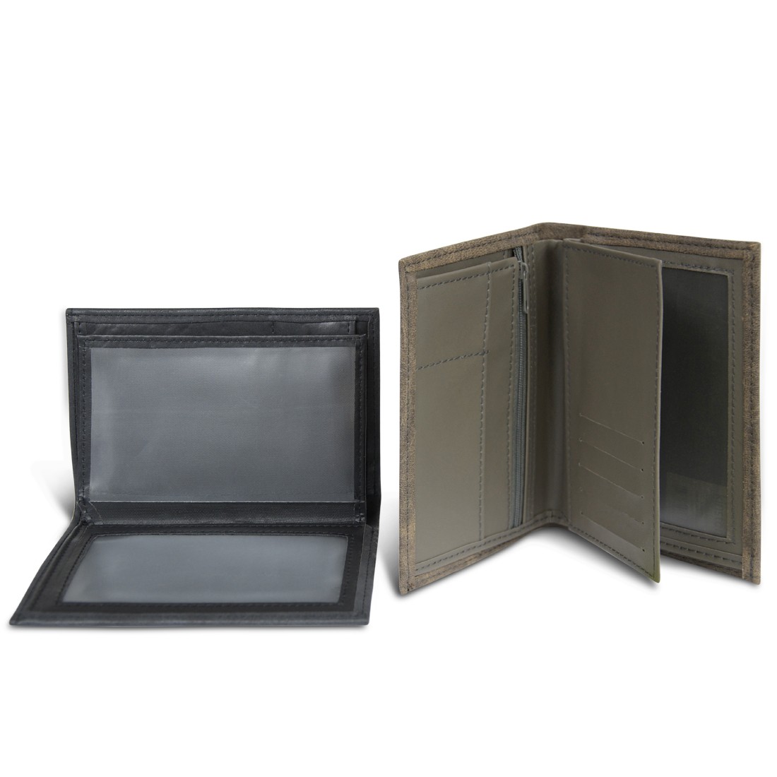 Un volet central avec d’un côté une poche plate transparente et quatre emplacements pour cartes bancaires sur l’autre côté.