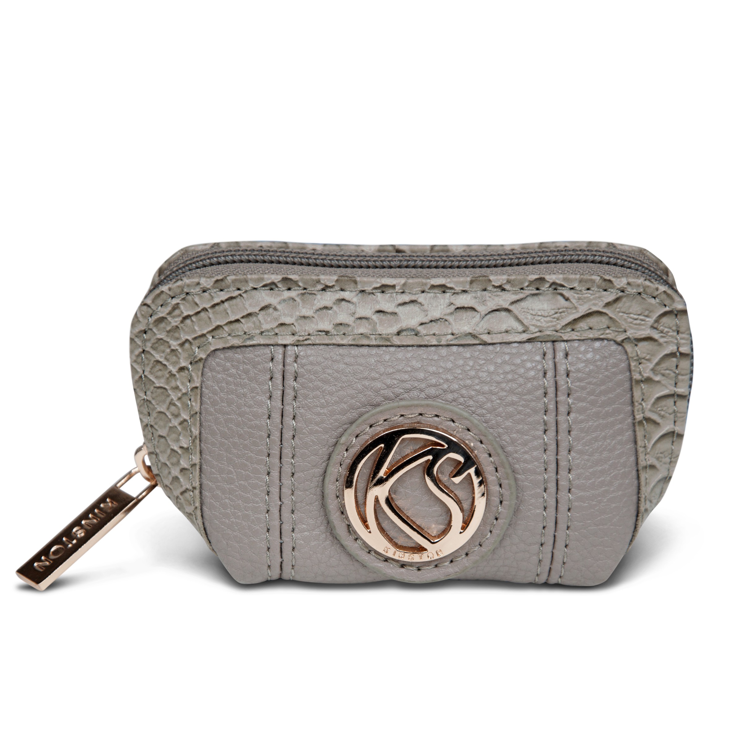 Ce porte-monnaie femme est particulièrement élégant avec ses pièces métalliques pleines d’éclat, son long curseur logoté et sa broche ronde « KS ».