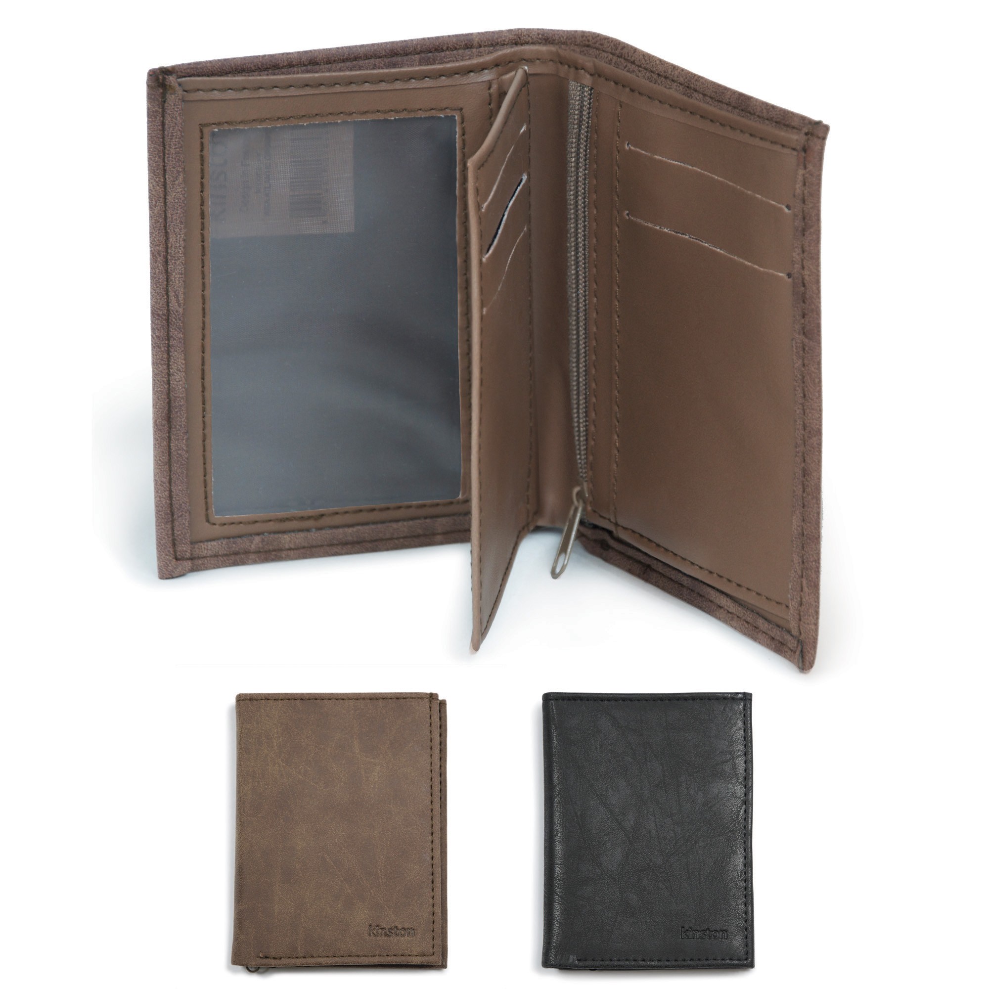 Portefeuille synthétique à effet vieilli, logoté KINSTON. Petit format vertical, que l'on glisse dans la poche, mais non moins pratique grâce à ses trois volets. Il comprend une grande poche plate à billets. Un volet avec un porte-monnaie zippé à soufflet, sur lequel se trouve une poche plate et deux emplacements pour cartes bancaires. Un volet central avec d’un côté une poche plate transparente et trois emplacements pour cartes bancaires, de l’autre côté une grande poche plate transparente. Enfin, un troisième volet avec une seconde poche plate transparente.