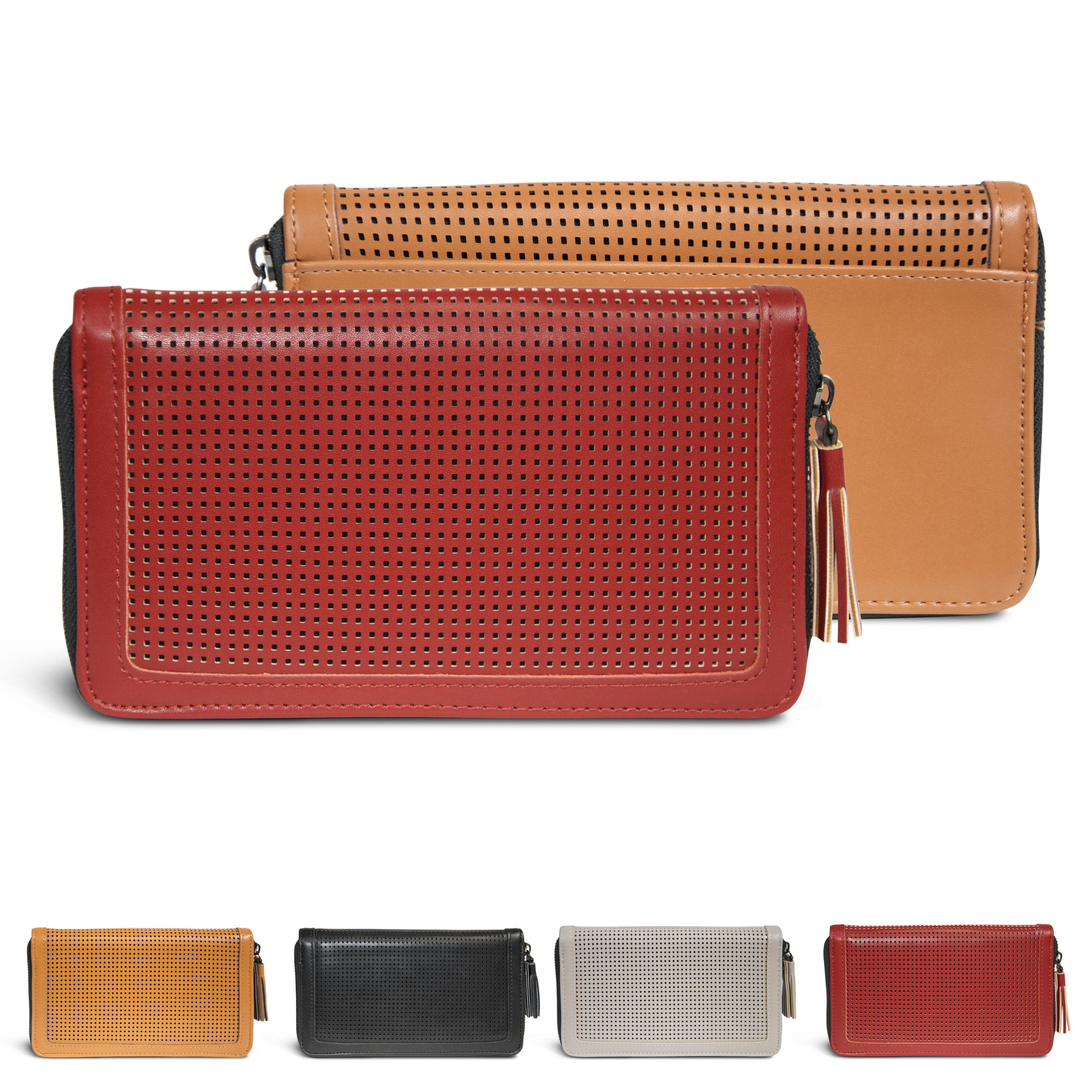 Grand portefeuille horizontal, bi-matières ton sur ton. La bordure et le dos sont en synthétique lisse, le devant est en synthétique perforé.