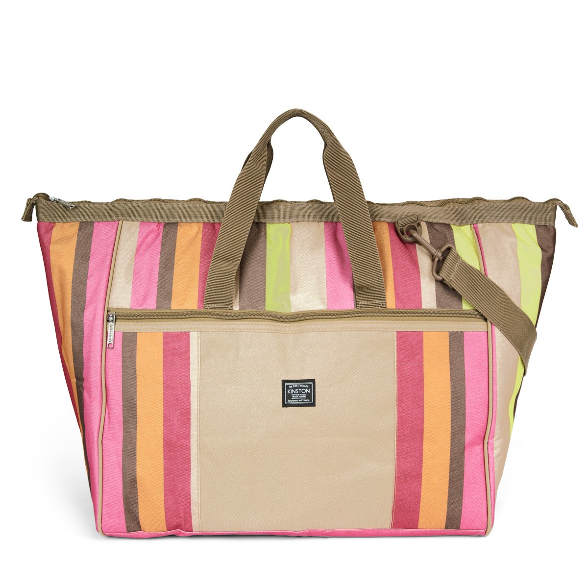 Bandoulière ajustable, en polyester gros grain, pour un porté épaule ou croisé. Bordures et sangles unies camel – Motif à large rayures bayadères.